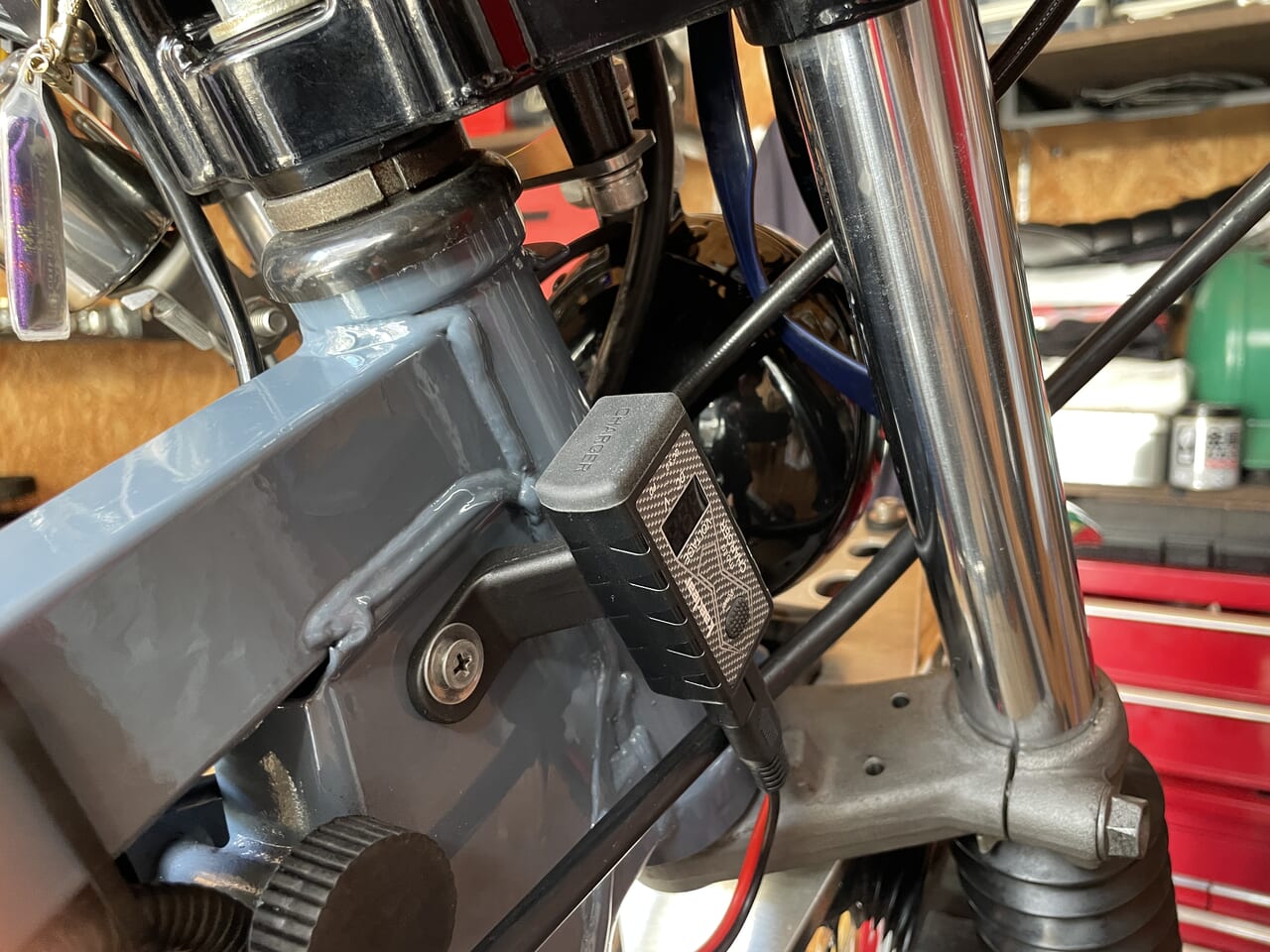 スマホを装着できるように、USB電源を設置します。選んだのは、これ↑。バッ直で電源を取るのでスイッチ機能がついているものにしました。最近、電気系統ばかり触ってますが、ずいぶん慣れてきた。