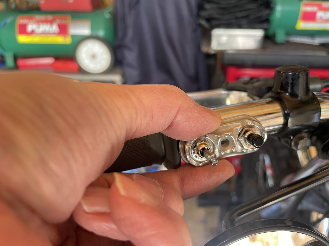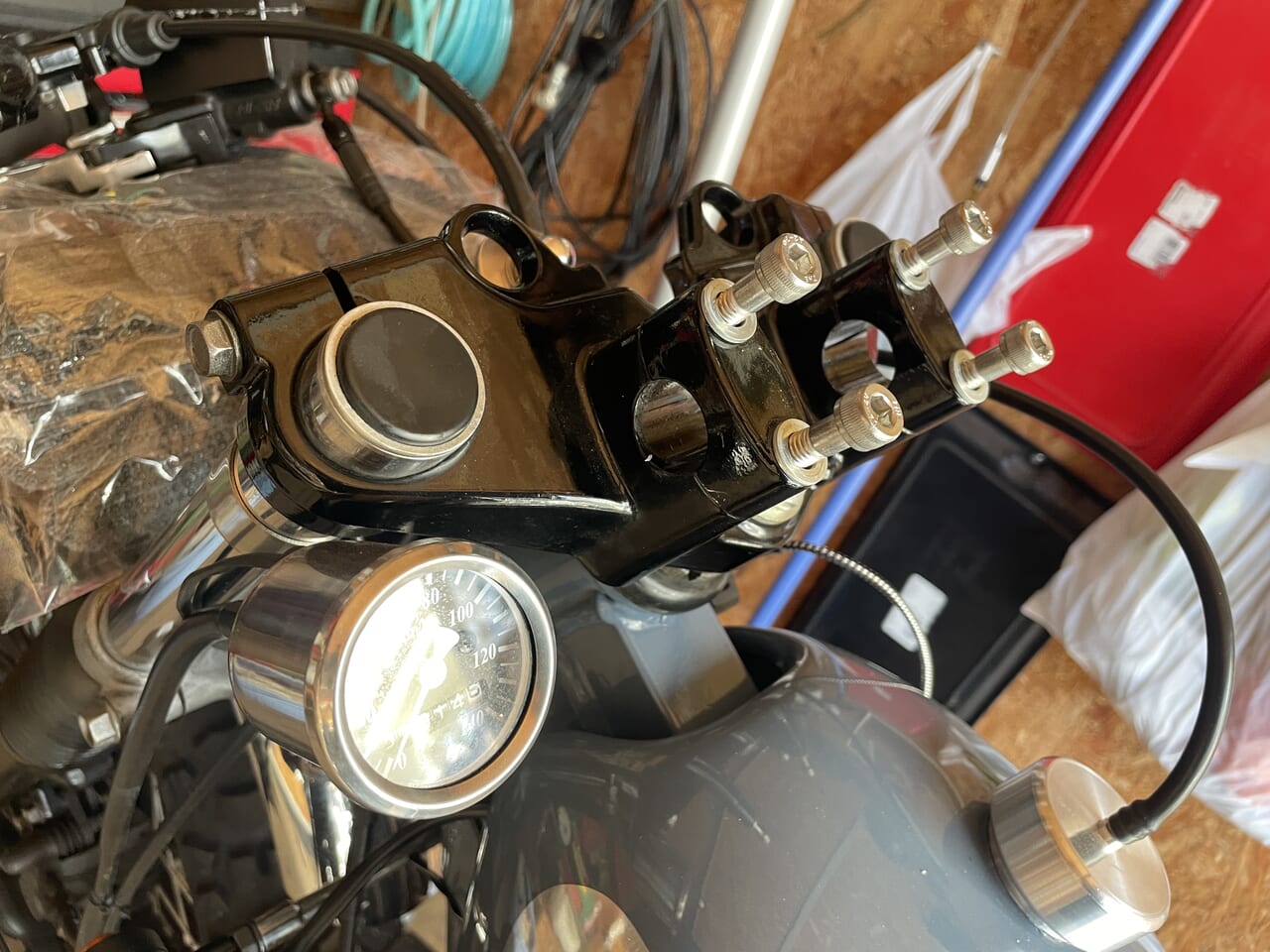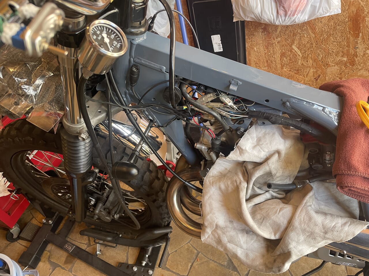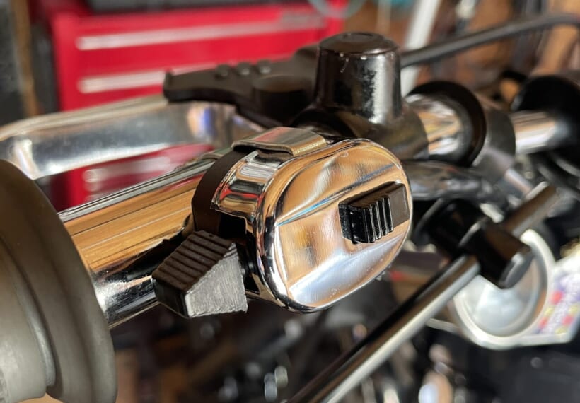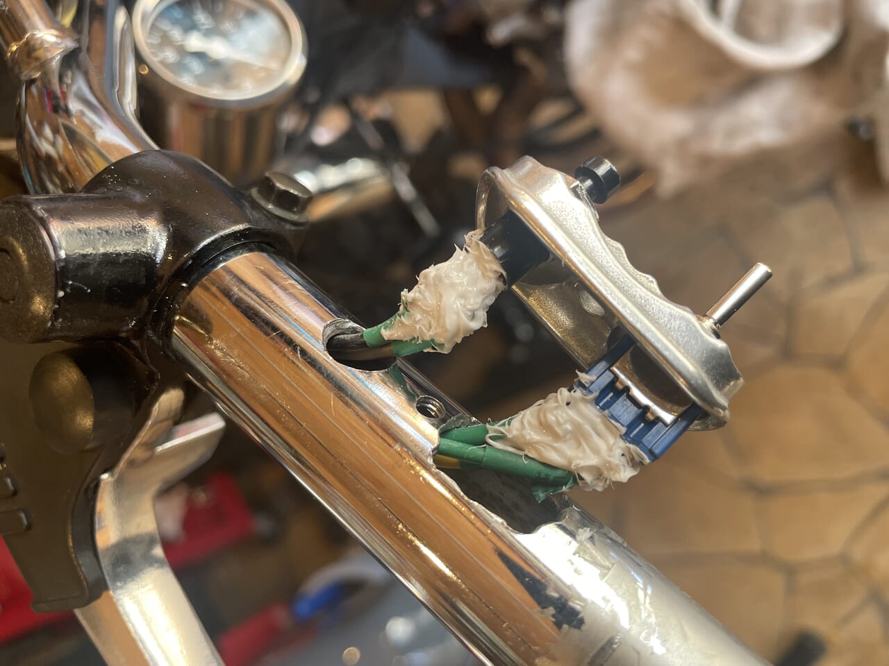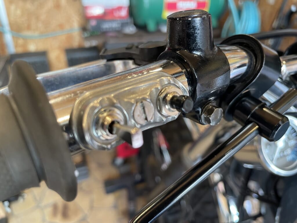 これを元に、ウインカーとホーンのスイッチ配線を新しいスイッチに移設します。ハンドル中通しするので、ハンドルとタンクを脱着して配線処理して絶縁処理もして戻していきます。