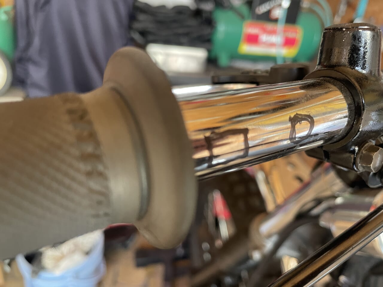 配線はハンドル中通ししますのでハンドルに穴あけ加工が必要です。この位置に装着するのでスイッチ埋め込み用のマーキングをして、ドリルで線に沿って複数穴をあけてヤスリで削って穴を滑らかにします。